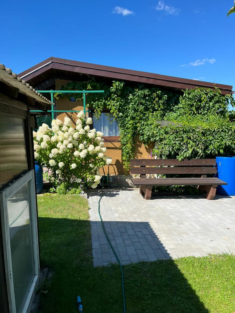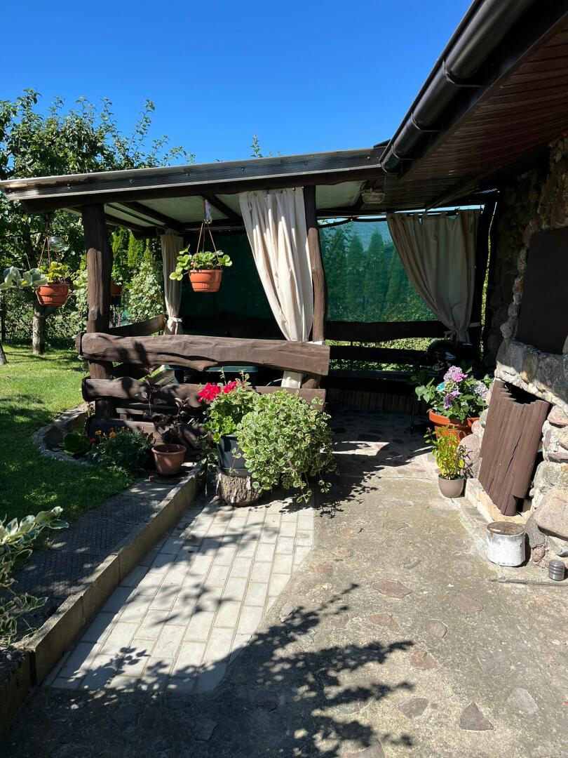 - murowany domek z altaną, 2 pomieszczenia + komórka na narzędzia,